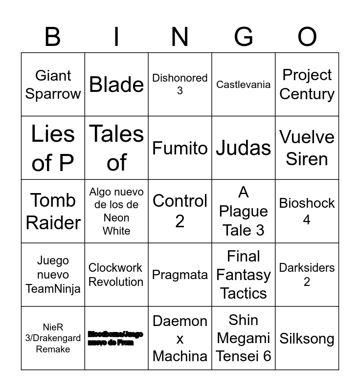 This bingo card has a free space and 24 words: Clockwork Revolution, Bloodborne/Juego nuevo de From, Fumito, NieR 3/Drakengard Remake, Project Century, Giant Sparrow, Lies of P, Blade, A Plague Tale 3, Pragmata, Judas, Tomb Raider, Final Fantasy Tactics, Darksiders 2, Tales of, Shin Megami Tensei 6, Bioshock 4, Dishonored 3, Vuelve Siren, Algo nuevo de los de Neon White, Silksong, Juego nuevo TeamNinja, Castlevania and Daemon x Machina.