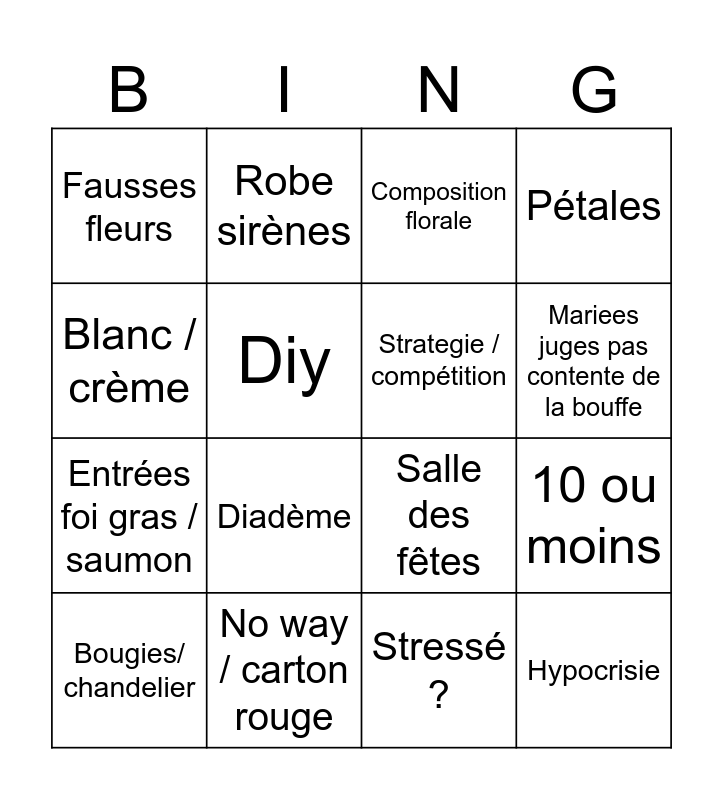This bingo card has 16 words: No way / carton rouge, 10 ou moins, Composition florale, Fausses fleurs, Entrées foi gras / saumon, Robe sirènes, Salle des fêtes, Stressé ?, Blanc / crème, Diy, Bougies/ chandelier, Pétales, Diadème, Mariees juges pas contente de la bouffe, Strategie / compétition and Hypocrisie.