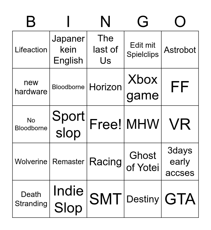 This bingo card has a free space and 24 words: Death Stranding, Remaster, Horizon, Destiny, Astrobot, Lifeaction, Japaner kein English, The last of Us, MHW, VR, No Bloodborne, Bloodborne, Ghost of Yotei, 3days early accses, new hardware, Indie Slop, SMT, Edit mit Spielclips, FF, Wolverine, Sport slop, Racing, Xbox game and GTA.