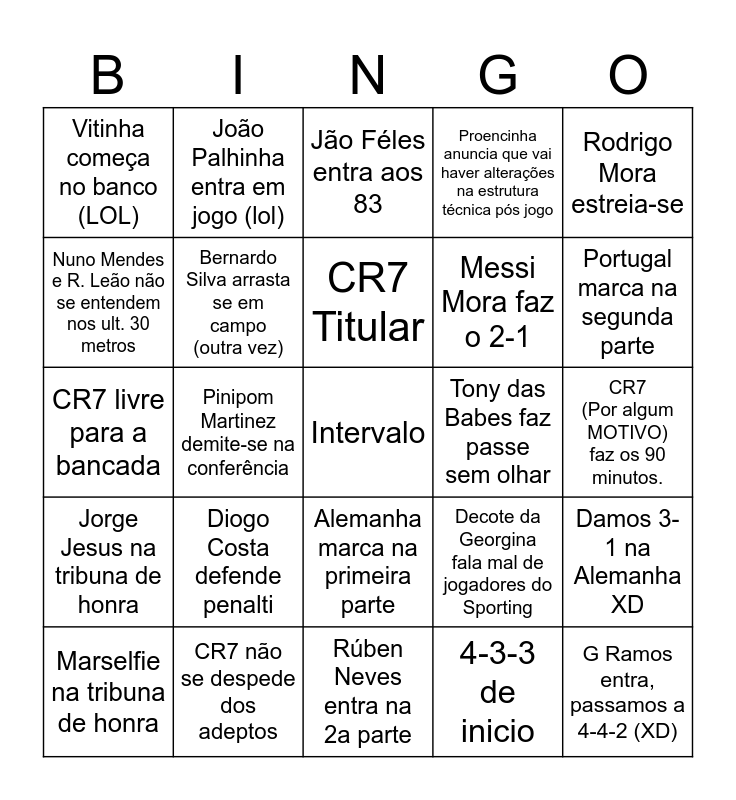 This bingo card has a free space and 24 words: Diogo Costa defende penalti, CR7 não se despede dos adeptos, CR7 Titular, Marselfie na tribuna de honra, Rodrigo Mora estreia-se, Vitinha começa no banco (LOL), Nuno Mendes e R. Leão não se entendem nos ult. 30 metros, João Palhinha entra em jogo (lol), Tony das Babes faz passe sem olhar, Alemanha marca na primeira parte, Messi Mora faz o 2-1, CR7 livre para a bancada, Decote da Georgina fala mal de jogadores do Sporting, Damos 3-1 na Alemanha XD, Bernardo Silva arrasta se em campo (outra vez), 4-3-3 de inicio, CR7 (Por algum MOTIVO) faz os 90 minutos., Jão Féles entra aos 83, Portugal marca na segunda parte, Pinipom Martinez demite-se na conferência, G Ramos entra, passamos a 4-4-2 (XD), Jorge Jesus na tribuna de honra, Proencinha anuncia que vai haver alterações na estrutura técnica pós jogo and Rúben Neves entra na 2a parte.