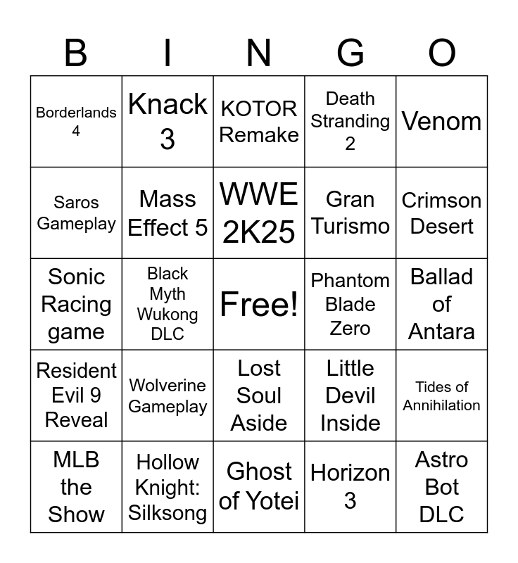 This bingo card has a free space and 24 words: Wolverine Gameplay, Hollow Knight: Silksong, WWE 2K25, MLB the Show, Venom, Borderlands 4, Saros Gameplay, Knack 3, Phantom Blade Zero, Lost Soul Aside, Gran Turismo, Sonic Racing game, Little Devil Inside, Tides of Annihilation, Mass Effect 5, Horizon 3, Ballad of Antara, KOTOR Remake, Crimson Desert, Black Myth Wukong DLC, Astro Bot DLC, Resident Evil 9 Reveal, Death Stranding 2 and Ghost of Yotei.