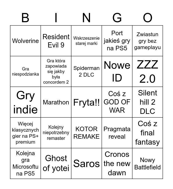 This bingo card has a free space and 24 words: Kolejny niepotrzebny remaster, Ghost of yotei, Spiderman 2 DLC, Kolejna gra Microsoftu na PS5, Zwiastun gry bez gameplayu, Wolverine, Gra niespodzianka, Resident Evil 9, Coś z GOD OF WAR, KOTOR REMAKE, Nowe ID, Gry indie, Pragmata reveal, Coś z final fantasy, Gra która zapowiada się jakby była concordem 2, Cronos the new dawn, Silent hill 2 DLC, Wskrzeszenie starej marki, ZZZ 2.0, Marathon, Nowy Battlefield, Więcej klasycznych gier na PS+ premium, Port jakieś gry na PS5 and Saros.
