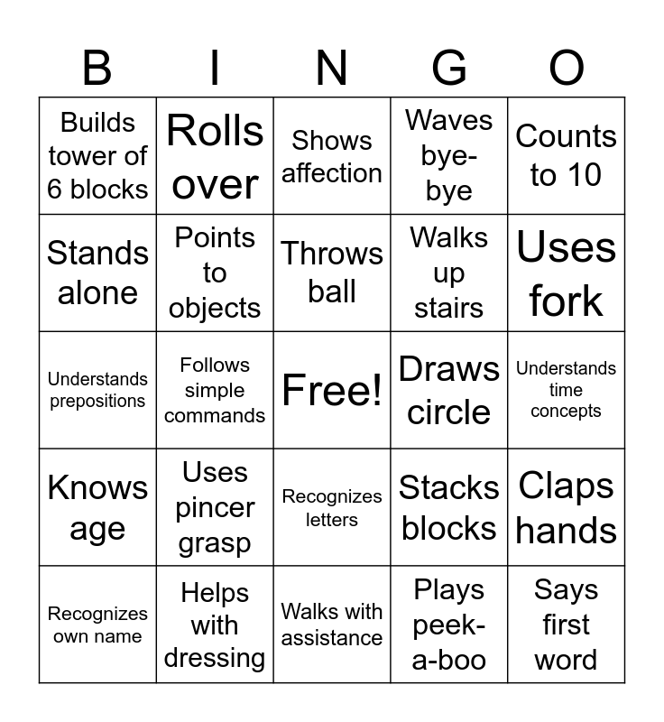 This bingo card has a free space and 51 words: Sits unsupported, Says first word, Crawls, Walks with assistance, Uses pincer grasp, Smiles socially, Rolls over, Babbles, Stands alone, Feeds self with spoon, Points to objects, Waves bye-bye, Claps hands, Stacks blocks, Uses two-word phrases, Runs, Throws ball, Draws circle, Names colors, Counts to 10, Follows simple commands, Plays peek-a-boo, Builds tower of 6 blocks, Walks up stairs, Jumps, Rides tricycle, Uses fork, Turns pages of book, Recognizes own name, Shows affection, Plays with other children, Uses simple sentences, Knows body parts, Asks questions, Understands 'no', Helps with dressing, Uses toilet, Brushes teeth, Draws square, Tells stories, Understands time concepts, Knows age, Knows full name, Understands opposites, Counts objects, Sorts shapes, Understands prepositions, Uses plurals, Understands cause and effect, Recognizes letters and Recognizes numbers.