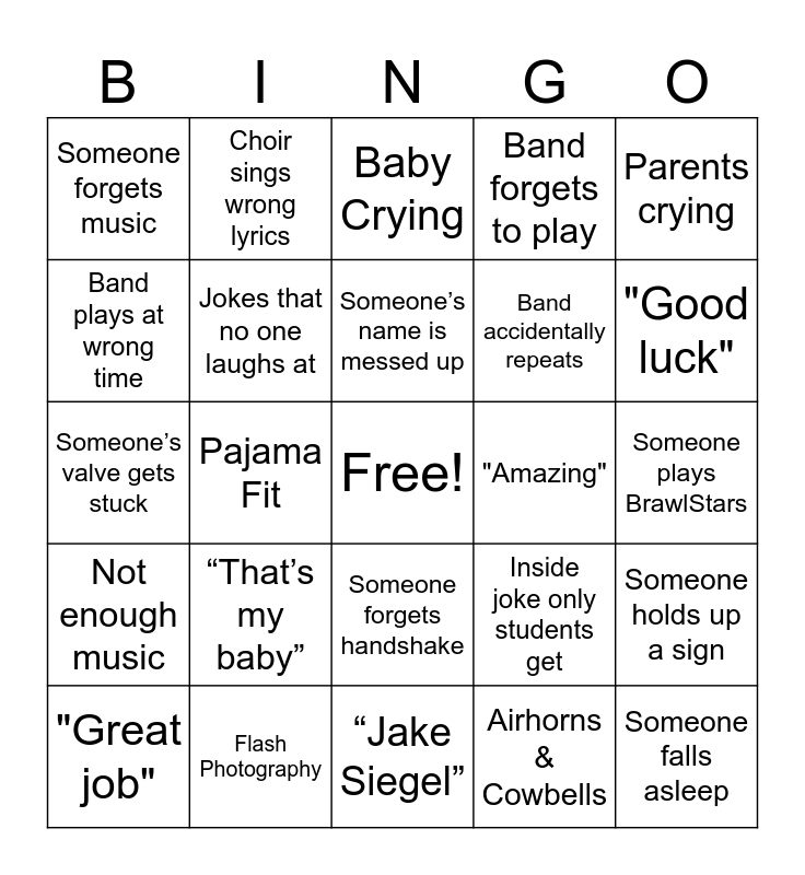 This bingo card has a free space and 34 words: Someone trips on stage on stage, Airhorns & Cowbells, Teachers pretend to get emotional, Band plays out of time, Not enough music, Jokes that no one laughs at, Parents crying, "Great job", Choir sings wrong lyrics, Parents yell, Someone’s name is messed up, Baby Crying, Someone plays BlockBlast, Lasts over 3 hours, "Amazing", "Good luck", Flash Photography, Someone’s valve gets stuck, “That’s my baby”, Inside joke only students get, Someone forgets handshake, Not enough music stands, Someone forgets music, Someone plays BrawlStars, “Jake Siegel”, Someone falls asleep, Band forgets to play, Someone starts eating, Band accidentally repeats, Band plays at wrong time, Confetti, Pajama Fit, Someone holds up a sign and Trumpets suck.
