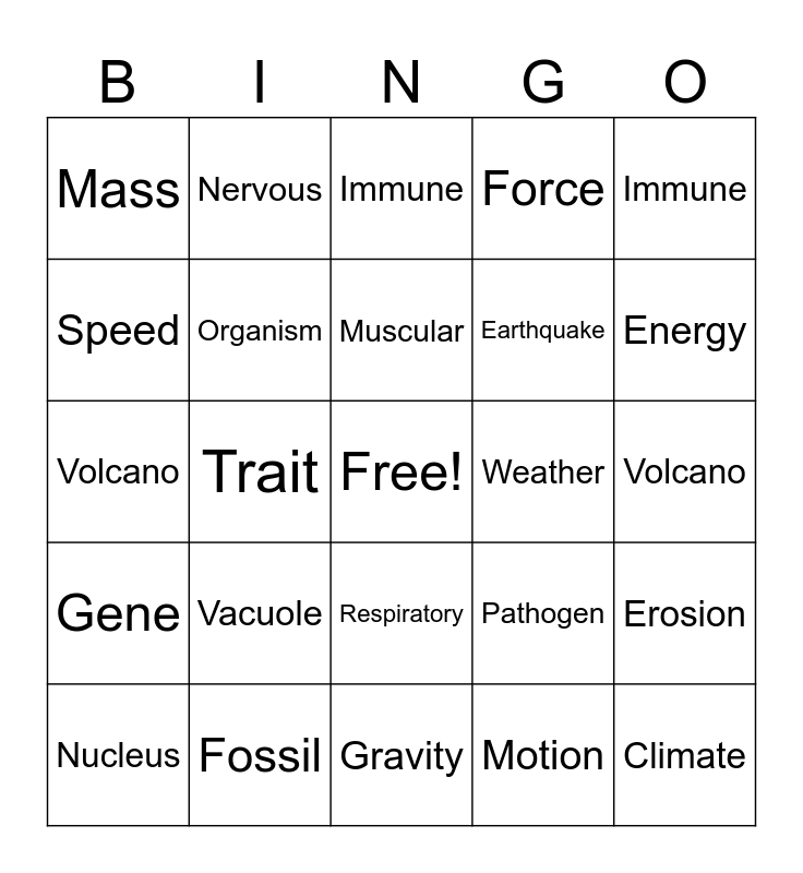 This bingo card has a free space and 39 words: Cell, Organ, Tissue, Organism, Nucleus, Respiratory, Muscular, Digestive, Immune, Gene, Trait, Force, Climate, Volcano, Weather, Vacuole, Homeostasis, Mass, Motion, Pathogen, Speed, Gravity, Earthquake, Energy, Cytoplasm, Ribosome, Membrane, Circulatory, Skeletal, Nervous, Digestive, Excretory, Immune, Fossil, Motion, Friction, Erosion, Volcano and Dominant.