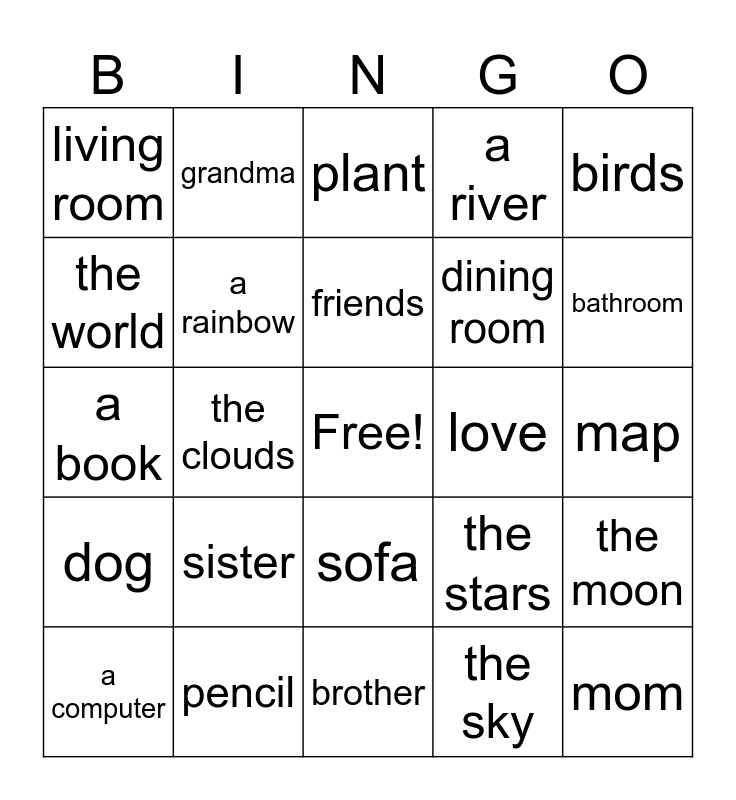 This bingo card has a free space and 50 words: wonderful, mom, dad, brother, sister, grandpa, grandma, the Sun, the world, a butterfly, a rainbow, a river, the moon, the stars, the mountains, a flower, friends, love, a tree, birds, the clouds, the sky, living room, dining room, bedroom, kitchen, bathroom, mirror, plant, sofa, TV, microwave, bed, bathtub, pencil, pen, crayon, eraser, whiteboard, map, clock, table, chair, desk, a computer, a book, rock, a lamp, dog and a cat.