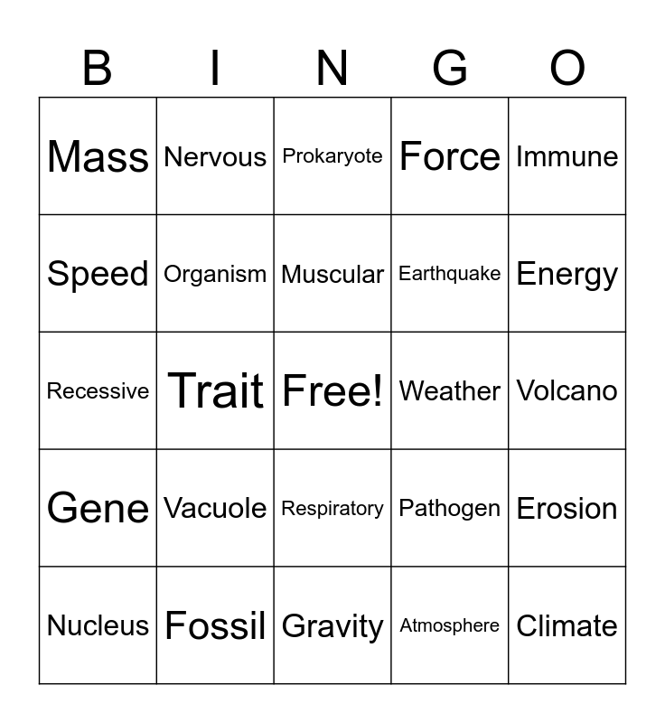 This bingo card has a free space and 39 words: Cell, Organ, Tissue, Organism, Nucleus, Respiratory, Muscular, Digestive, Immune, Gene, Trait, Force, Climate, Volcano, Weather, Vacuole, Homeostasis, Mass, Motion, Pathogen, Speed, Gravity, Earthquake, Energy, Cytoplasm, Ribosome, Membrane, Circulatory, Skeletal, Nervous, Ozone, Excretory, Prokaryote, Fossil, Atmosphere, Friction, Erosion, Recessive and Dominant.
