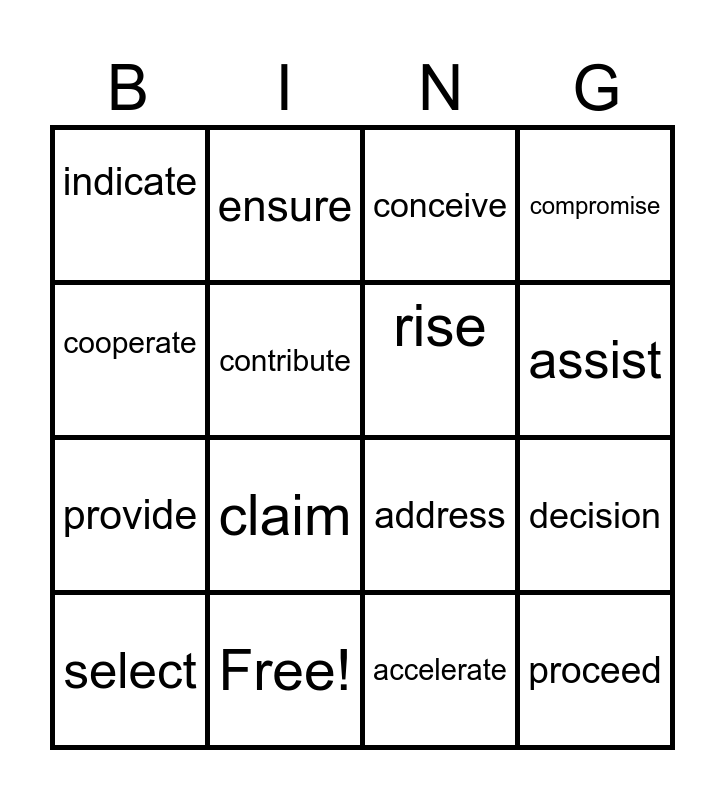 This bingo card has 25 words: substantial, permit, assist, devote (oneself) to, cooperate, indicate, contribute, ensure, Free!, participate, provide, address, consider, delay, rise, numerous, accelerate, conceive, claim, decision, select, develop, proceed, compromise and review.