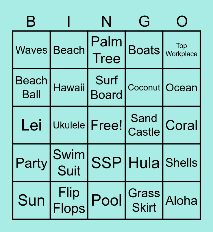 This bingo card has a free space and 29 words: Sun, Annual Picnic, Ukulele, Tiki, Waves, Palm Tree, Hawaii, Swim Suit, Sand Castle, Flip Flops, Coral, Aloha, Pool, Grass Skirt, Ocean, Star Fish, SSP, Party, Top Workplace, Lei, Hula, Sun Glasses, Coconut, Beach Ball, Boats, Beach, Shells, Surf Board and Ohana.