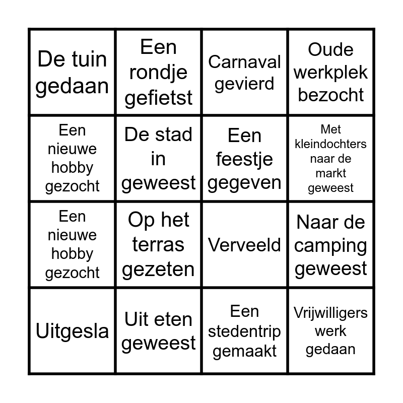 This bingo card has 21 words: Uit eten geweest, Op zolder gezeten, Een rondje gefietst, Op de kleindochters gepast, Een stedentrip gemaakt, Een feestje gegeven, De tuin gedaan, Carnaval gevierd, Verveeld, Met kleindochters naar de markt geweest, Een nieuwe hobby gezocht, Oude werkplek bezocht, Vrijwilligers werk gedaan, Een boek gelezen, De stad in geweest, Met vrienden op pad, Uitgesla, Op het terras gezeten, Een nieuwe hobby gezocht, Naar de camping geweest and Een biertje gedronken.