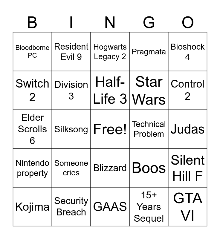 This bingo card has a free space and 29 words: Kojima, Valve, Silksong, Titanfall 3, Bloodborne PC, Hogwarts Legacy 2, Division 3, Someone cries, Technical Problem, Security Breach, Judas, GTA VI, GAAS, 15+ Years Sequel, Control 2, Max Payne, Blizzard, Nintendo property, Bioshock 4, Elder Scrolls 6, Boos, Sleeping Dogs, Star Wars, Switch 2, Pragmata, Resident Evil 9, Silent Hill F, Half-Life 3 and Ett eller annet med Mario.