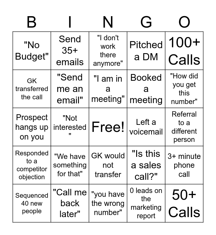 This bingo card has a free space and 24 words: "We have something for that", "Call me back later", "I am in a meeting", Sequenced 40 new people, 100+ Calls, "No Budget", GK transferred the call, Send 35+ emails, Left a voicemail, GK would not transfer, Booked a meeting, Prospect hangs up on you, "Is this a sales call?", 3+ minute phone call, "Send me an email", 0 leads on the marketing report, Referral to a different person, "I don't work there anymore", "How did you get this number", "Not interested ", 50+ Calls, Responded to a competitor objection, Pitched a DM and "you have the wrong number".