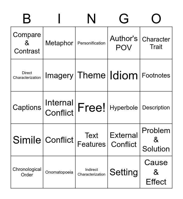 This bingo card has a free space and 24 words: Conflict, Onomatopoeia, Theme, Chronological Order, Character Trait, Compare & Contrast, Direct Characterization, Metaphor, Hyperbole, Text Features, Idiom, Captions, External Conflict, Problem & Solution, Imagery, Setting, Description, Personification, Footnotes, Internal Conflict, Cause & Effect, Simile, Author's POV and Indirect Characterization.
