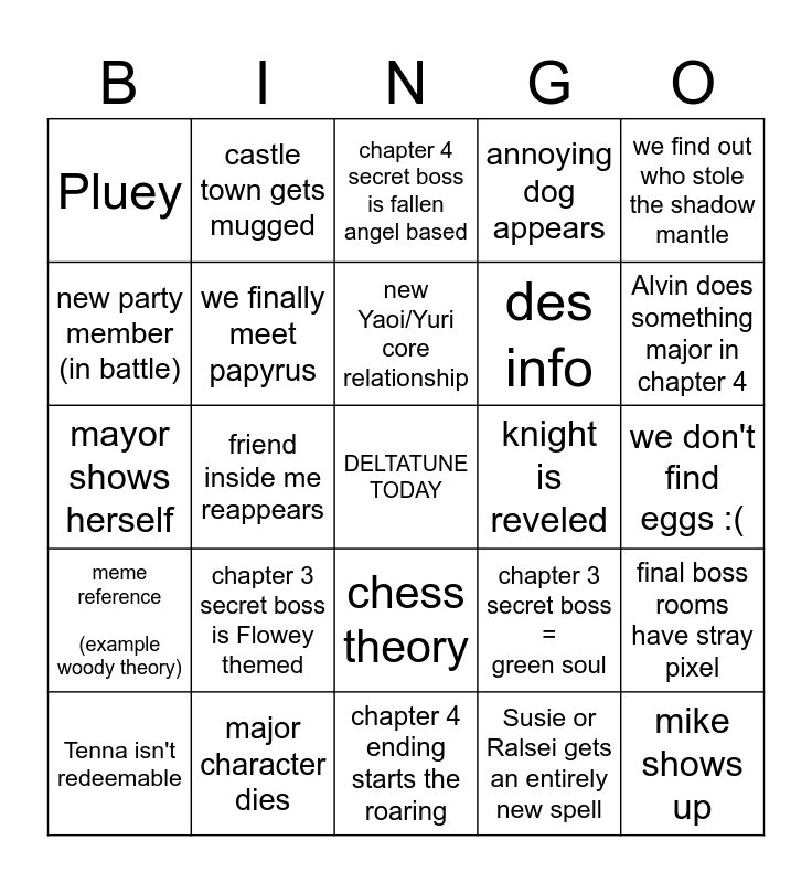 This bingo card has a free space and 24 words: chapter 3 secret boss is Flowey themed, major character dies, new Yaoi/Yuri core relationship, Tenna isn't redeemable, we find out who stole the shadow mantle, Pluey, new party member (in battle), castle town gets mugged, knight is reveled, chess theory, des info, mayor shows herself, chapter 3 secret boss = green soul, final boss rooms have stray pixel, we finally meet papyrus, Susie or Ralsei gets an entirely new spell, we don't find eggs :(, chapter 4 secret boss is fallen angel based, Alvin does something major in chapter 4, friend inside me reappears, mike shows up, meme reference (example woody theory), annoying dog appears and chapter 4 ending starts the roaring.