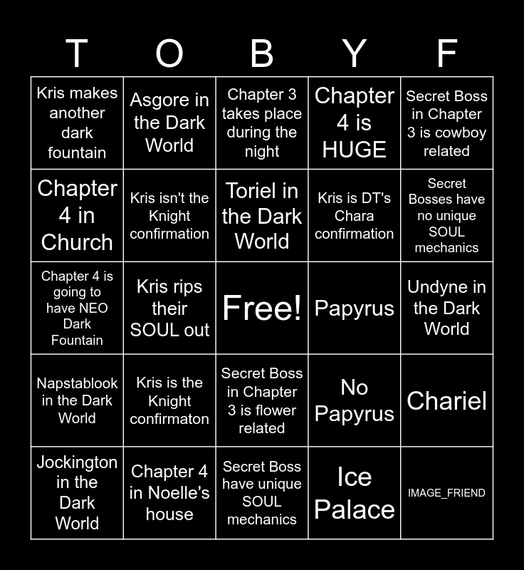 This bingo card has a free space and 24 words: Kris is the Knight confirmaton, Chapter 4 in Noelle's house, Toriel in the Dark World, Jockington in the Dark World, Secret Boss in Chapter 3 is cowboy related, Kris makes another dark fountain, Chapter 4 in Church, Asgore in the Dark World, Papyrus, Secret Boss in Chapter 3 is flower related, Kris is DT's Chara confirmation, Chapter 4 is going to have NEO Dark Fountain, No Papyrus, Chariel, Kris isn't the Knight confirmation, Ice Palace, Undyne in the Dark World, Chapter 3 takes place during the night, Secret Bosses have no unique SOUL mechanics, Kris rips their SOUL out, IMAGE_FRIEND, Napstablook in the Dark World, Chapter 4 is HUGE and Secret Boss have unique SOUL mechanics.