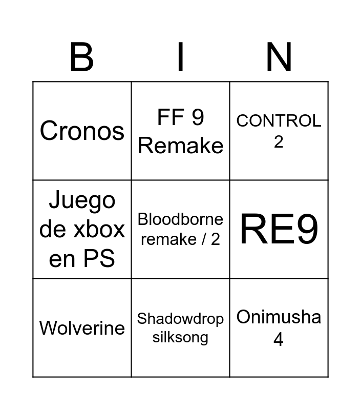 This bingo card has a free space and 8 words: RE9, CONTROL 2, FF 9 Remake, Wolverine, Cronos, Onimusha 4, Juego de xbox en PS and Shadowdrop silksong.