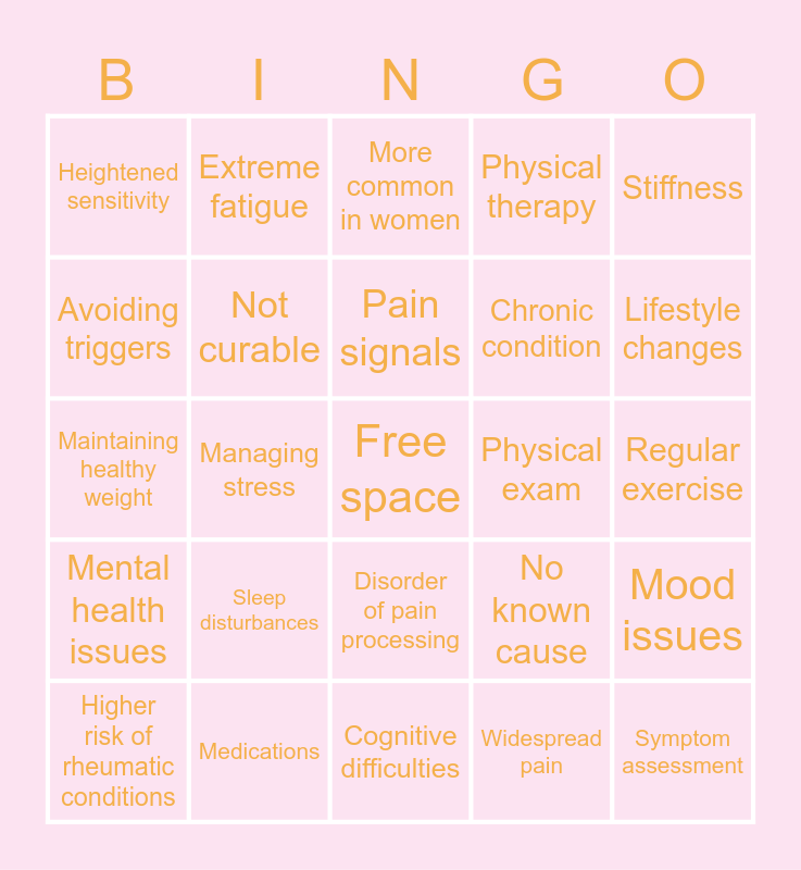 This bingo card has a free space and 24 words: Sleep disturbances, Medications, Pain signals, Higher risk of rheumatic conditions, Stiffness, Heightened sensitivity, Avoiding triggers, Extreme fatigue, Physical exam, Disorder of pain processing, Chronic condition, Maintaining healthy weight, No known cause, Mood issues, Not curable, Widespread pain, Regular exercise, More common in women, Lifestyle changes, Managing stress, Symptom assessment, Mental health issues, Physical therapy and Cognitive difficulties.