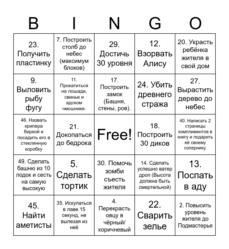 This bingo card has a free space and 50 words: 1. Добыть алмаз, 2. Повысить уровень жителя до Подмастерье, 3. Взорваться в пустынном храме, не лутая сундуки., 4. Перекрасть овцу в чёрный/коричневый, 5. Сделать тортик, 6. Сделать алмазную мотыгу, 7. Построить столб до небес (максимум блоков), 8. Умереть от крипера, зомби, скелета и паука (1 игрок), 9. Выловить рыбу фугу, 10. Построить секс-машину с овцой, 11. Прокатиться на лошади, свинье и адском чмошнике., 12. Взорвать Алису, 13. Поспать в аду, 14. Сделать успешно ватер дроп (Высота должна быть смертельной), 15. Создать железного и снежного голема, 16. Зачаровать деревянный меч, 17. Построить замок (Башня, стены, ров)., 18. Построить 30 диков, 19. Получить золотое яблоко, 20. Украсть ребёнка жителя в свой дом, 21. Докопаться до бедрока, 22. Сварить зелье, 23. Получить пластинку, 24. Убить древнего стража, 25. Найти закопанное сокровище, 26. Надеть на себя 4 типа разной брони, 27. Вырастить дерево до небес, 28. Убить вардена, 29. Достичь 30 уровня, 30. Помочь зомби съесть жителя, 31. Построить церковь/собор, 32. Приручить собаку и кота, 33. Посетить храм пустыни и джунгли, 34. Убить враждебного моба с помощью ловушки, 35. Искупаться в лаве 15 секунд, не вылезая из неё, 36. Убить ифрита только снежками, 37. Поймать в вёдра 3 разных вида животных, 38. Закрыть себя в коробке из обсидиана, 39. Получить 3 раза статус отравления разными способами, 40. Написать 2 страницы комплиментов в книгу и подарить её своему сопернику., 41. Получить 6 разных типов цветов, 42. Построить таджика, желающего любви, 43. Убить попугая, скормив ему печенье, 44. Одновременно выпить воды в игре и реальной жизни, 45. Найти аметисты, 46. Назвать крипера биркой и посадить его в стеклянную коробку, 47.Спрыгнуть с блока слизи на блок мёда, 48. Получить 32 блока меди (1 блок = 9 меди), 49. Сделать башню из 10 лодок и сесть на самую высокую and 50. Превратить пиглина в зомби-пиглина.