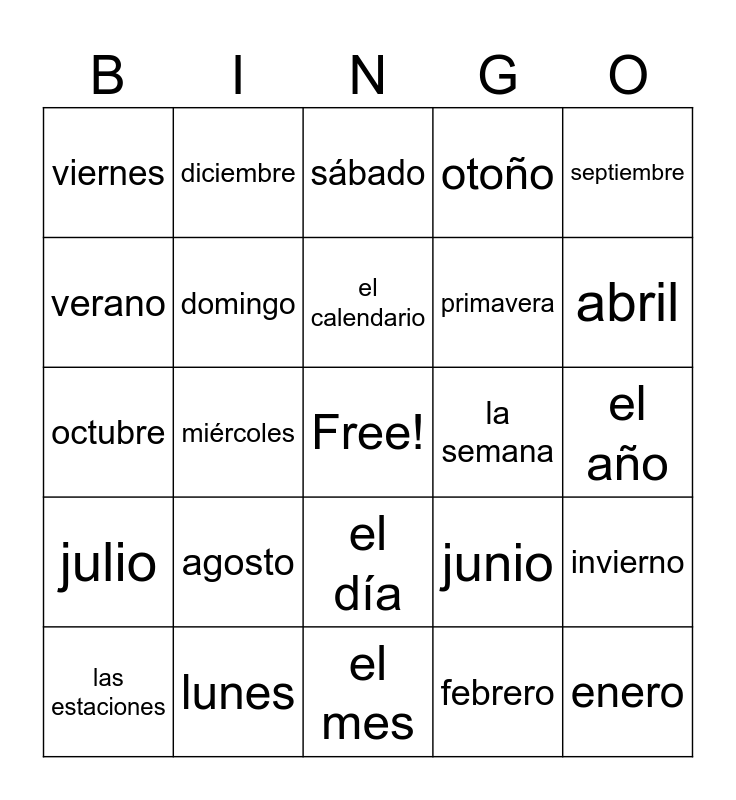 This bingo card has a free space and 30 words: lunes, martes, miércoles, jueves, viernes, sábado, domingo, el día, la semana, el mes, el año, enero, febrero, marzo, abril, mayo, junio, julio, agosto, septiembre, octubre, noviembre, diciembre, primavera, verano, otoño, invierno, las estaciones, el calendario and la fecha.