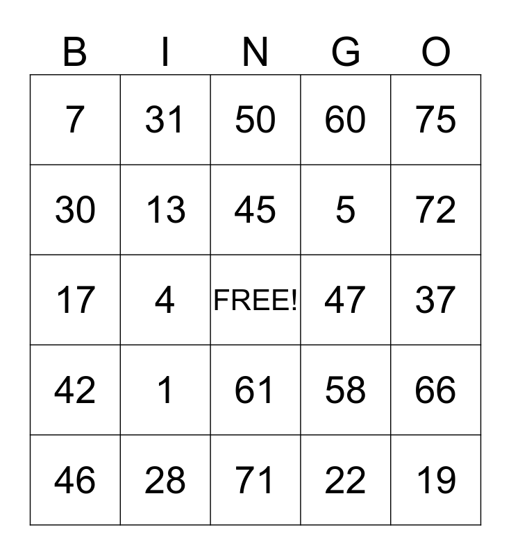 This bingo card has a free space and 24 words: 1, 28, 45, 46, 75, 7, 30, 31, 47, 61, 5, 17, 58, 66, 13, 22, 37, 50, 72, 4, 19, 42, 60 and 71.