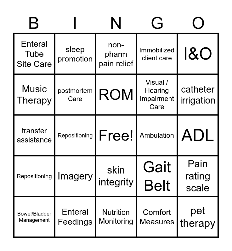 This bingo card has a free space and 25 words: Bowel/Bladder Management, Imagery, ROM, Comfort Measures, catheter irrigation, Enteral Tube Site Care, sleep promotion, non-pharm pain relief, Visual / Hearing Impairment Care, Pain rating scale, transfer assistance, postmortem Care, Gait Belt, pet therapy, Music Therapy, Enteral Feedings, Nutrition Monitoring, Immobilized client care, ADL, Repositioning, Repositioning, skin integrity, Ambulation, I&O and Complementary Therapy.