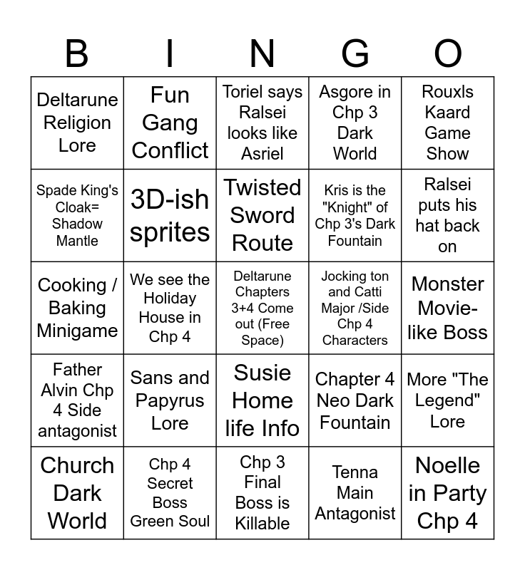 This bingo card has a free space and 24 words: Church Dark World, Sans and Papyrus Lore, Twisted Sword Route, Tenna Main Antagonist, Rouxls Kaard Game Show, Deltarune Religion Lore, Fun Gang Conflict, Toriel says Ralsei looks like Asriel, Jocking ton and Catti Major /Side Chp 4 Characters, Monster Movie-like Boss, Cooking / Baking Minigame, 3D-ish sprites, Chapter 4 Neo Dark Fountain, More "The Legend" Lore, Spade King's Cloak= Shadow Mantle, Chp 4 Secret Boss Green Soul, Chp 3 Final Boss is Killable, Asgore in Chp 3 Dark World, Ralsei puts his hat back on, Father Alvin Chp 4 Side antagonist, We see the Holiday House in Chp 4, Susie Home life Info, Kris is the "Knight" of Chp 3's Dark Fountain and Noelle in Party Chp 4.