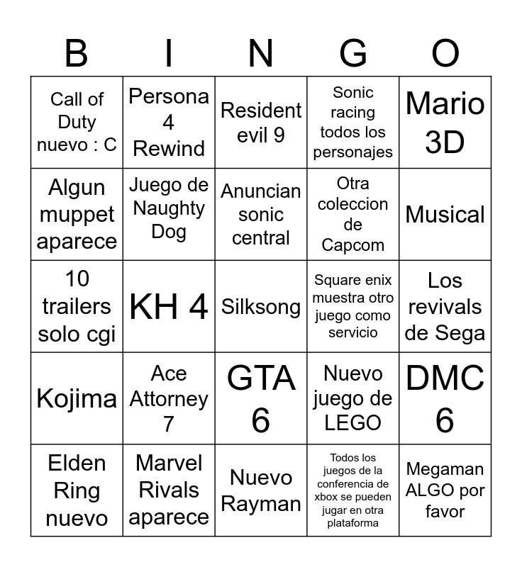 This bingo card has a free space and 24 words: Elden Ring nuevo, Ace Attorney 7, Anuncian sonic central, Todos los juegos de la conferencia de xbox se pueden jugar en otra plataforma, Mario 3D, Call of Duty nuevo : C, Persona 4 Rewind, Resident evil 9, Square enix muestra otro juego como servicio, Los revivals de Sega, 10 trailers solo cgi, Juego de Naughty Dog, Nuevo juego de LEGO, DMC 6, Algun muppet aparece, Marvel Rivals aparece, Nuevo Rayman, Sonic racing todos los personajes, Musical, Kojima, KH 4, GTA 6, Otra coleccion de Capcom and Megaman ALGO por favor.