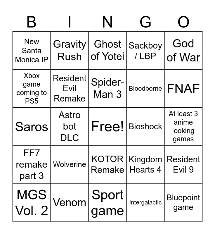 This bingo card has a free space and 24 words: Wolverine, Venom, Spider-Man 3, MGS Vol. 2, God of War, New Santa Monica IP, Xbox game coming to PS5, Gravity Rush, Bioshock, KOTOR Remake, Bloodborne, Saros, Kingdom Hearts 4, Resident Evil 9, Resident Evil Remake, Intergalactic, At least 3 anime looking games, Ghost of Yotei, FNAF, Astro bot DLC, Bluepoint game, FF7 remake part 3, Sackboy / LBP and Sport game.