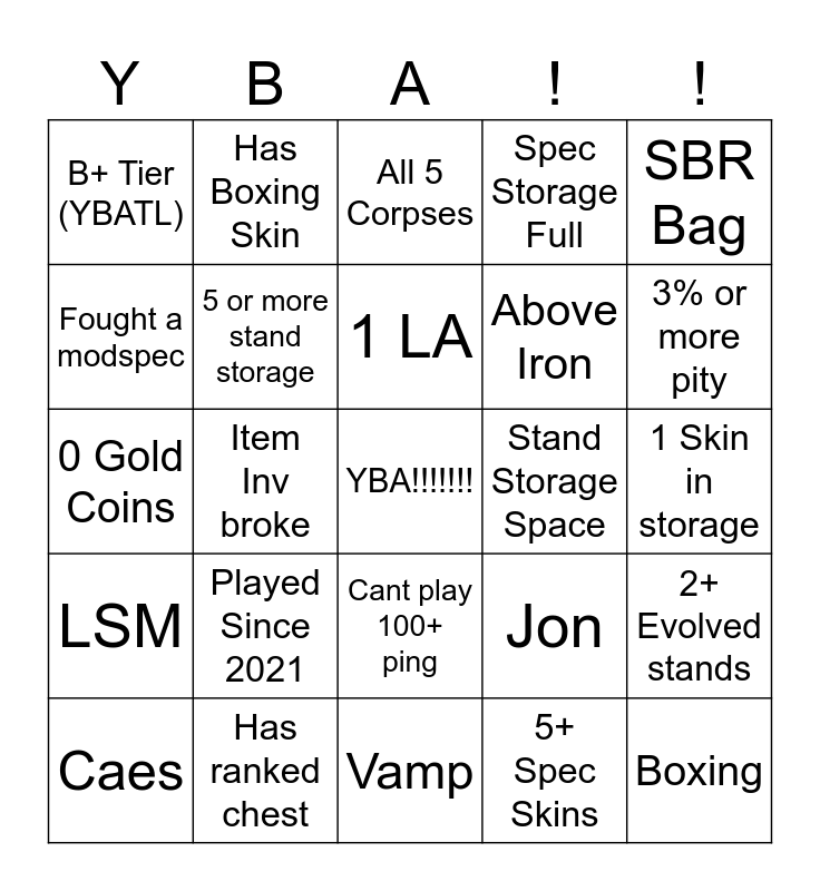 This bingo card has 40 words: 100h+ Playtime, 0 Gold Coins, All Spec Items, 5 or more stand storage, Has ranked chest, Cant play 100+ ping, 1 LA, Unob Item, SBR Bag, LSM, Item Inv broke, Spec Storage Full, YBA!!!!!!!, 1 Skin in storage, Stand Storage Space, Played Since 2021, Has Finisher, B+ Tier (YBATL), Metamancer, All 5 Corpses, 2+ Evolved stands, 5+ Spec Skins, Above Iron, Fought a modspec, Waiting for CDR Shirt, EU, NA, Asia, Boxing, Pluck, No Rokas, Caes, No Ribs, Jon, 3% or more pity, Vamp, Green Baby, Has Bat/Pluck Skin, Has Boxing Skin and Req Arrow.