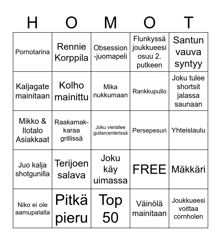 This bingo card has 25 words: Terijoen salava, Top 50, Mika nukkumaan, Niko ei ole aamupalalla, Santun vauva syntyy, Pornotarina, Kaljagate mainitaan, Rennie Korppila, Persepesuri, Joku käy uimassa, Rankkupullo, Mikko & Ilotalo Asiakkaat, FREE, Mäkkäri, Kolho mainittu, Joukkueesi voittaa cornholen, Yhteislaulu, Obsession -juomapeli, Joku tulee shortsit jalassa saunaan, Raakamak- karaa grillissä, Joku vierailee guitarcenterissä, Pitkä pieru, Juo kalja shotgunilla, Flunkyssä joukkueesi osuu 2. putkeen and Väinölä mainitaan.