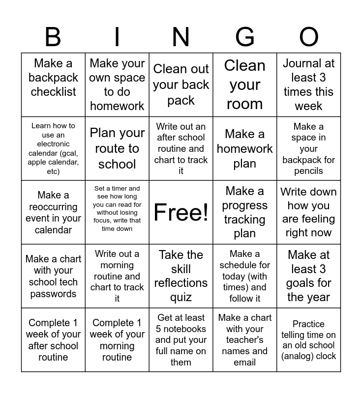 This bingo card has a free space and 24 words: Write out a morning routine and chart to track it, Complete 1 week of your morning routine, Write out an after school routine and chart to track it, Complete 1 week of your after school routine, Journal at least 3 times this week, Make a backpack checklist, Learn how to use an electronic calendar (gcal, apple calendar, etc), Make your own space to do homework, Make a progress tracking plan, Take the skill reflections quiz, Make a homework plan, Make a reoccurring event in your calendar, Make a schedule for today (with times) and follow it, Make at least 3 goals for the year, Plan your route to school, Make a chart with your teacher's names and email, Write down how you are feeling right now, Clean out your back pack, Make a space in your backpack for pencils, Set a timer and see how long you can read for without losing focus, write that time down, Practice telling time on an old school (analog) clock, Make a chart with your school tech passwords, Clean your room and Get at least 5 notebooks and put your full name on them.
