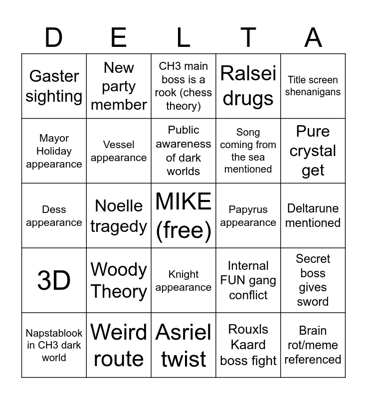 This bingo card has a free space and 24 words: Woody Theory, Weird route, Public awareness of dark worlds, Napstablook in CH3 dark world, Title screen shenanigans, Gaster sighting, Mayor Holiday appearance, New party member, Papyrus appearance, Knight appearance, Song coming from the sea mentioned, Dess appearance, Internal FUN gang conflict, Secret boss gives sword, Vessel appearance, Rouxls Kaard boss fight, Deltarune mentioned, CH3 main boss is a rook (chess theory), Pure crystal get, Noelle tragedy, Brain rot/meme referenced, 3D, Ralsei drugs and Asriel twist.