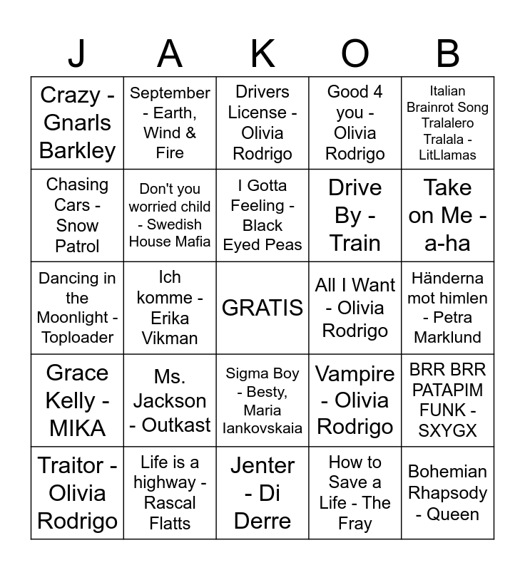 This bingo card has a free space and 24 words: Ms. Jackson - Outkast, Life is a highway - Rascal Flatts, I Gotta Feeling - Black Eyed Peas, Traitor - Olivia Rodrigo, Italian Brainrot Song Tralalero Tralala - LitLlamas, Crazy - Gnarls Barkley, Chasing Cars - Snow Patrol, September - Earth, Wind & Fire, All I Want - Olivia Rodrigo, Sigma Boy - Besty, Maria Iankovskaia, Drive By - Train, Dancing in the Moonlight - Toploader, Vampire - Olivia Rodrigo, BRR BRR PATAPIM FUNK - SXYGX, Don't you worried child - Swedish House Mafia, How to Save a Life - The Fray, Händerna mot himlen - Petra Marklund, Drivers License - Olivia Rodrigo, Take on Me - a-ha, Ich komme - Erika Vikman, Bohemian Rhapsody - Queen, Grace Kelly - MIKA, Good 4 you - Olivia Rodrigo and Jenter - Di Derre.