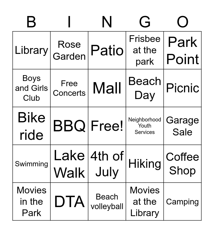 This bingo card has a free space and 24 words: Lake Walk, DTA, Mall, Movies in the Park, Park Point, Library, Boys and Girls Club, Rose Garden, Neighborhood Youth Services, 4th of July, Beach Day, Bike ride, Hiking, Coffee Shop, Free Concerts, Movies at the Library, Garage Sale, Patio, Picnic, BBQ, Camping, Swimming, Frisbee at the park and Beach volleyball.