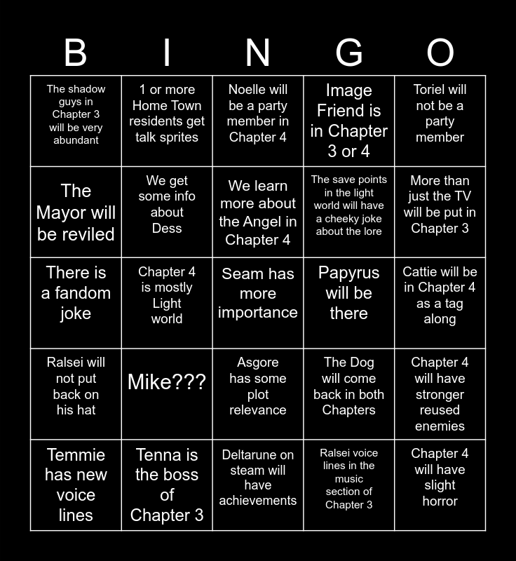 This bingo card has 30 words: Tenna is the boss of Chapter 3, Pluey is a character either Light-or Darkner, Chapter 4 is mostly Light world, Spamton goes to Castle-town, The shadow guys in Chapter 3 will be very abundant, Noelle will be a party member in Chapter 4, We get some info about Dess, Asgore has some plot relevance, Papyrus will be there, Deltarune on steam will have achievements, Cattie will be in Chapter 4 as a tag along, Seam has more importance, Ralsei voice lines in the music section of Chapter 3, Chapter 4 will have slight horror, More than just the TV will be put in Chapter 3, The release of Deltarune will come with more Merch, The Dog will come back in both Chapters, Ralsei will not put back on his hat, Mike???, Toriel will not be a party member, There is a fandom joke, The Nitendo Switch 2 room on PC will use both mouse and arrow keys, 1 or more Home Town residents get talk sprites, The save points in the light world will have a cheeky joke about the lore, The Mayor will be reviled, Image Friend is in Chapter 3 or 4, Chapter 4 will have stronger reused enemies, Temmie has new voice lines, We learn more about the Angel in Chapter 4 and There is a Cartoon section in Chapter 3.