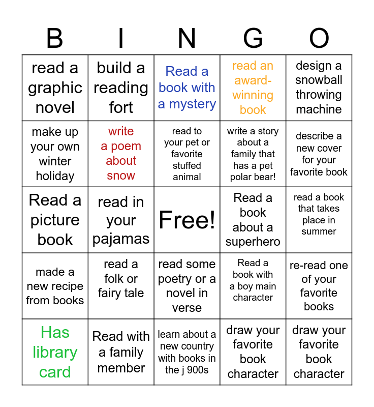 This bingo card has a free space and 34 words: Read under a blanket, draw your favorite book character, read a book outside, read about someone new with books, made a new recipe from books, write a poem about snow, design a snowball throwing machine, Has library card, build a reading fort, Read a book about friendship, read to your pet or favorite stuffed animal, Read a book with a mystery, watch a movie based on a book, Read the Bible, Read a book about a superhero, describe a new cover for your favorite book, Read with a family member, Read a picture book, read a folk or fairy tale, Read a book with a boy main character, read some poetry or a novel in verse, read a non-fiction graphic novel, read a graphic novel, read a book that takes place in summer, learn about a new country with books in the j 900s, draw your favorite book character, read an award- winning book, write a story about a boy, a girl, a dog, a cat, and snow!, write a story about a family that has a pet polar bear!, make up your own winter holiday, read a book in a new genre - like fantasy? try historical fiction instead, read in your pajamas, re-read one of your favorite books and read a book that was a childhood favorite of your parents.
