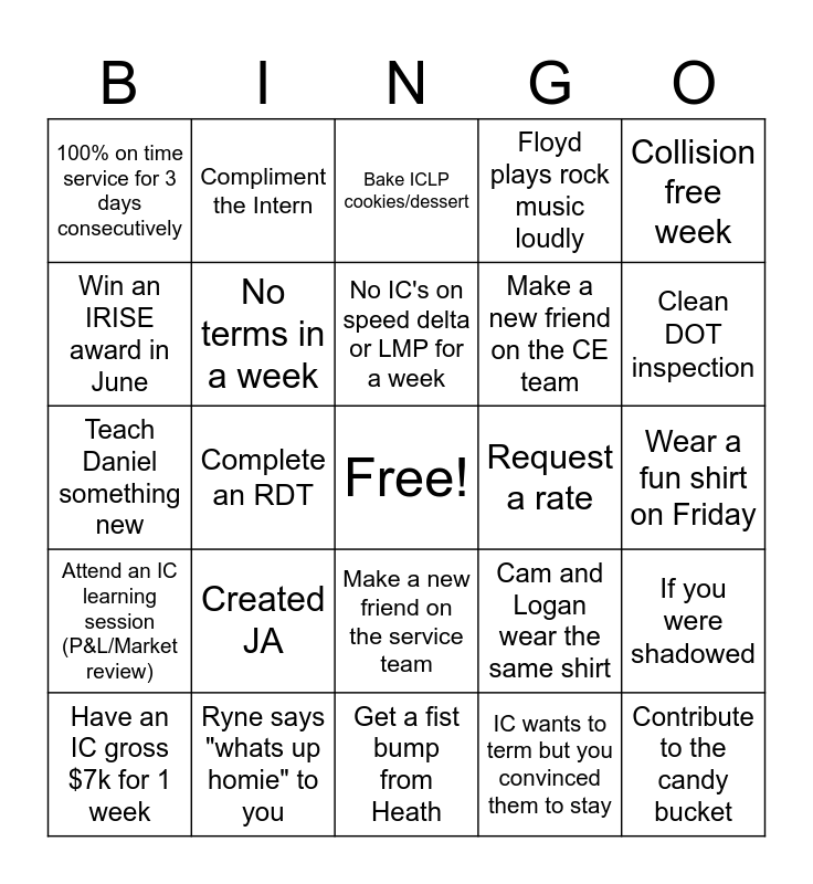 This bingo card has a free space and 24 words: Created JA, Ryne says "whats up homie" to you, No IC's on speed delta or LMP for a week, Have an IC gross $7k for 1 week, Collision free week, 100% on time service for 3 days consecutively, Win an IRISE award in June, Compliment the Intern, Request a rate, Make a new friend on the service team, Make a new friend on the CE team, Teach Daniel something new, Cam and Logan wear the same shirt, If you were shadowed, No terms in a week, IC wants to term but you convinced them to stay, Wear a fun shirt on Friday, Bake ICLP cookies/dessert, Clean DOT inspection, Complete an RDT, Contribute to the candy bucket, Attend an IC learning session (P&L/Market review), Floyd plays rock music loudly and Get a fist bump from Heath.