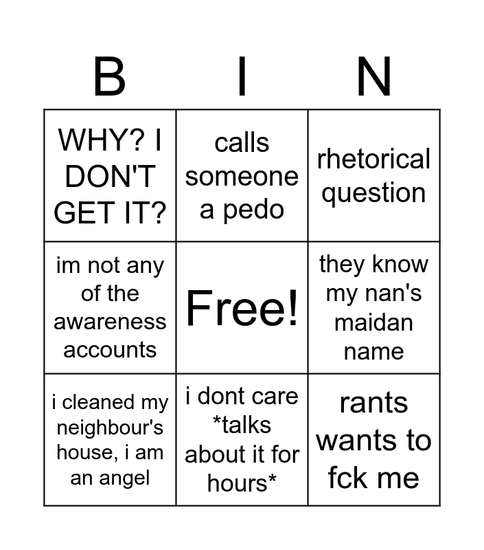 This bingo card has a free space and 8 words: they know my nan's maidan name, rhetorical question, calls someone a pedo, i cleaned my neighbour's house, i am an angel, WHY? I DON'T GET IT?, rants wants to fck me, im not any of the awareness accounts and i dont care *talks about it for hours*.
