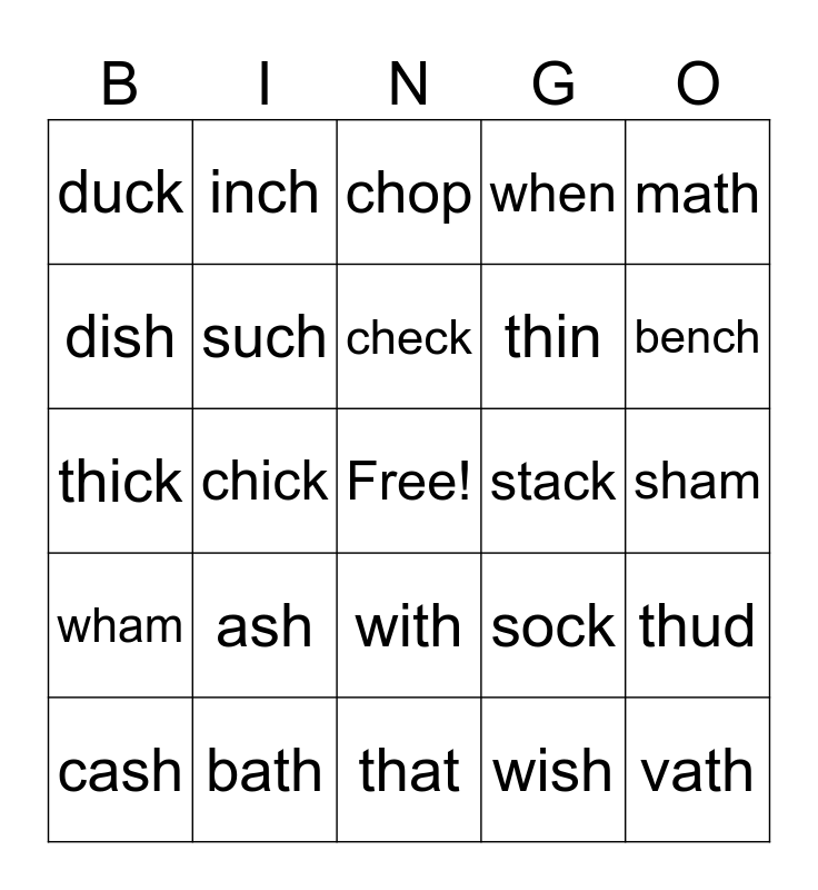 This bingo card has a free space and 24 words: ash, bath, check, cash, math, duck, dish, inch, stack, with, thin, thick, sock, thud, such, wish, sham, chop, bench, chick, vath, wham, when and that.