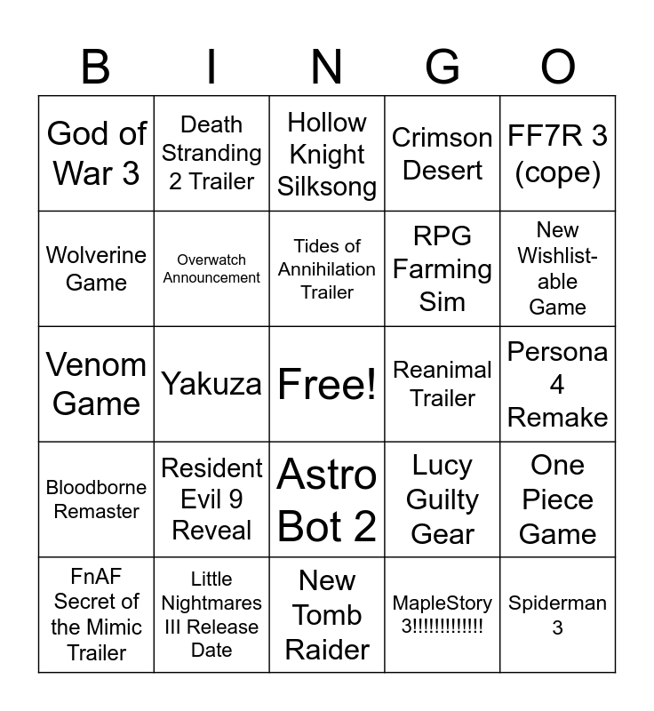 This bingo card has a free space and 24 words: Resident Evil 9 Reveal, Little Nightmares III Release Date, Tides of Annihilation Trailer, FnAF Secret of the Mimic Trailer, FF7R 3 (cope), God of War 3, Wolverine Game, Death Stranding 2 Trailer, Reanimal Trailer, Astro Bot 2, RPG Farming Sim, Venom Game, Lucy Guilty Gear, One Piece Game, Overwatch Announcement, MapleStory 3!!!!!!!!!!!!!, Persona 4 Remake, Hollow Knight Silksong, New Wishlist-able Game, Yakuza, Spiderman 3, Bloodborne Remaster, Crimson Desert and New Tomb Raider.