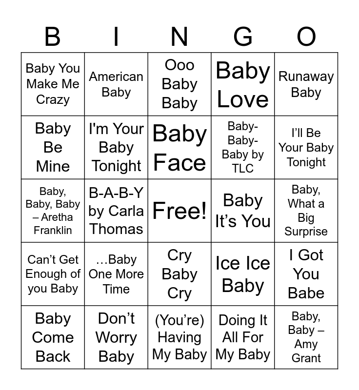 This bingo card has a free space and 37 words: Be My Baby, Always Be My Baby, Baby, You’re a Rich Man, I'm Your Baby Tonight, I Got You Babe, …Baby One More Time, Baby Face, Baby, Runaway Baby, Baby, Please Don’t Go, B-A-B-Y by Carla Thomas, Baby Love, Baby, Baby – Amy Grant, Baby, What a Big Surprise, Baby Be Mine, Can’t Get Enough of you Baby, Baby I’m Yours, Ooo Baby Baby, Cry Baby Cry, Baby It’s You, Baby You Make Me Crazy, I’ll Be Your Baby Tonight, Baby Come Back, (You’re) Having My Baby, Baby I Need Your Lovin’, Doing It All For My Baby, American Baby, Baby I’m-a Want You, Rock-a-Hula Baby, Yes Sir, That’s My Baby, Baby, I Love Your Way, Don’t Worry Baby, Baby, Baby, Baby – Aretha Franklin, Steppin’ Out With My Baby, Ice Ice Baby, Baby-Baby-Baby by TLC and Beach Baby.