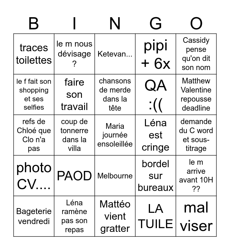 This bingo card has a free space and 24 words: PAOD, Léna ramène pas son repas, chansons de merde dans la tête, Bageterie vendredi, Cassidy pense qu'on dit son nom, traces toilettes, le f fait son shopping et ses selfies, le m nous dévisage ?, Léna est cringe, Melbourne, QA :((, refs de Chloé que Clo n'a pas, bordel sur bureaux, le m arrive avant 10H ??, faire son travail, LA TUILE, demande du C word et sous-titrage, Ketevan..., Matthew Valentine repousse deadline, coup de tonnerre dans la villa, mal viser, photo CV...., pipi + 6x and Mattéo vient gratter.