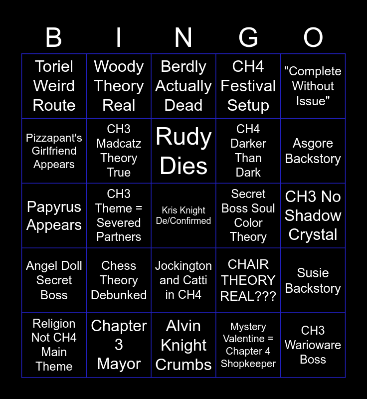 This bingo card has a free space and 24 words: Chess Theory Debunked, Chapter 3 Mayor, Rudy Dies, Religion Not CH4 Main Theme, "Complete Without Issue", Toriel Weird Route, Pizzapant's Girlfriend Appears, Woody Theory Real, Secret Boss Soul Color Theory, Jockington and Catti in CH4, CH4 Darker Than Dark, Papyrus Appears, CHAIR THEORY REAL???, Susie Backstory, CH3 Madcatz Theory True, Mystery Valentine = Chapter 4 Shopkeeper, CH3 No Shadow Crystal, Berdly Actually Dead, Asgore Backstory, CH3 Theme = Severed Partners, CH3 Warioware Boss, Angel Doll Secret Boss, CH4 Festival Setup and Alvin Knight Crumbs.