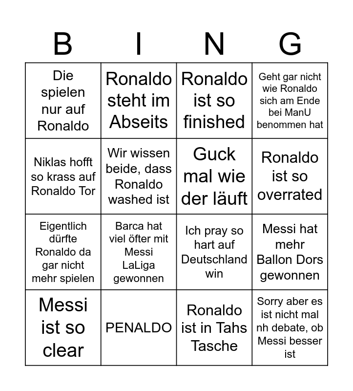 This bingo card has 16 words: PENALDO, Messi hat mehr Ballon Dors gewonnen, Ronaldo ist so finished, Die spielen nur auf Ronaldo, Eigentlich dürfte Ronaldo da gar nicht mehr spielen, Ronaldo steht im Abseits, Ich pray so hart auf Deutschland win, Ronaldo ist in Tahs Tasche, Niklas hofft so krass auf Ronaldo Tor, Wir wissen beide, dass Ronaldo washed ist, Messi ist so clear, Geht gar nicht wie Ronaldo sich am Ende bei ManU benommen hat, Barca hat viel öfter mit Messi LaLiga gewonnen, Ronaldo ist so overrated, Guck mal wie der läuft and Sorry aber es ist nicht mal nh debate, ob Messi besser ist.