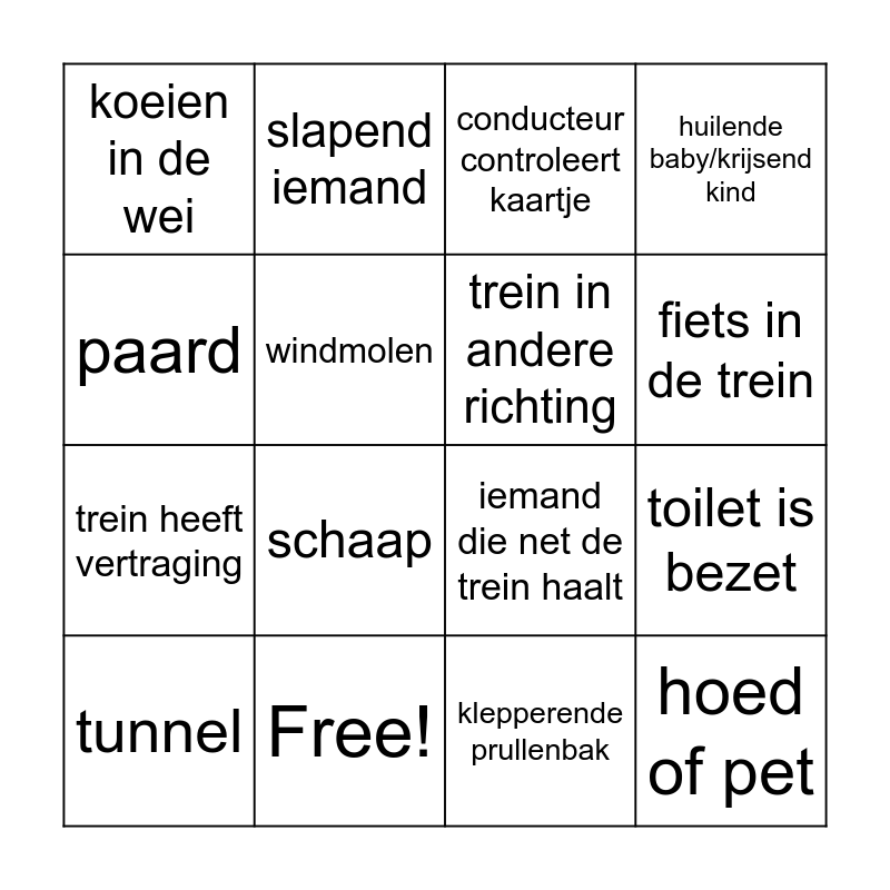 This bingo card has 16 words: Free!, toilet is bezet, conducteur controleert kaartje, koeien in de wei, trein heeft vertraging, slapend iemand, iemand die net de trein haalt, klepperende prullenbak, paard, windmolen, tunnel, huilende baby/krijsend kind, schaap, fiets in de trein, trein in andere richting and hoed of pet.