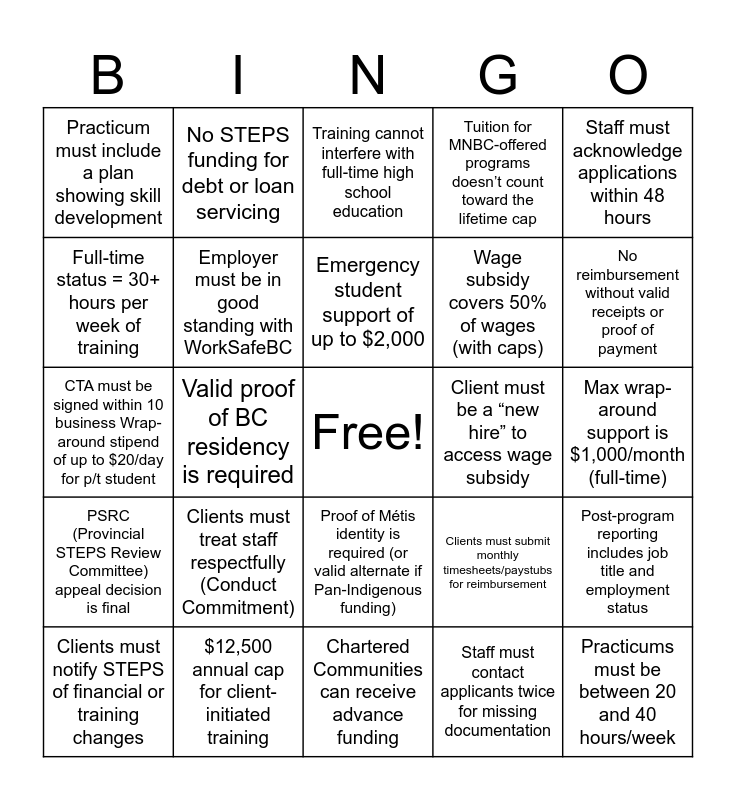 This bingo card has a free space and 41 words: 15 years old, CTA must be signed within 10 business Wrap-around stipend of up to $20/day for p/t student, Wrap-around stipend of up to $50/day for f/t students, Employer must be in good standing with WorkSafeBC, $12,500 annual cap for client-initiated training, Proof of Métis identity is required (or valid alternate if Pan-Indigenous funding), Emergency student support of up to $2,000, Application required for each year of multi-year programs, Staff must acknowledge applications within 48 hours, PSRC (Provincial STEPS Review Committee) appeal decision is final, Valid proof of BC residency is required, Tuition for MNBC-offered programs doesn’t count toward the lifetime cap, Practicums must be between 20 and 40 hours/week, Max wrap-around support is $1,000/month (full-time), Client must be a “new hire” to access wage subsidy, Clients must treat staff respectfully (Conduct Commitment), $20,000 annual cap for MNBC-offered training programs, Practicum must include a plan showing skill development, Clients may not participate in overlapping programs unless permitted, Training cannot interfere with full-time high school education, Post-program reporting includes job title and employment status, $50,000 is the lifetime funding threshold, Chartered Communities can receive advance funding, Wage subsidy covers 50% of wages (with caps), Appeals not allowed for applicants who exceed the lifetime limit, Maximum contract duration is one calendar year, Staff must contact applicants twice for missing documentation, Applications must be complete to be assessed, No reimbursement without valid receipts or proof of payment, Staff cannot share information with anyone other than the client, Funding is only available for costs after application completion, No STEPS funding for debt or loan servicing, Clients must notify STEPS of financial or training changes, Wage subsidy: max reimbursement based on $5 above minimum wage, Clients must submit monthly timesheets/paystubs for reimbursement, Full-time status = 30+ hours per week of training, Staff aim to assess applications within 15 business days, Emergency wrap-around includes relocation, equipment, attire, $20,000, minimum 3 months maximum 6 months and no less than 20 hours/week no more than 40 hours/week.