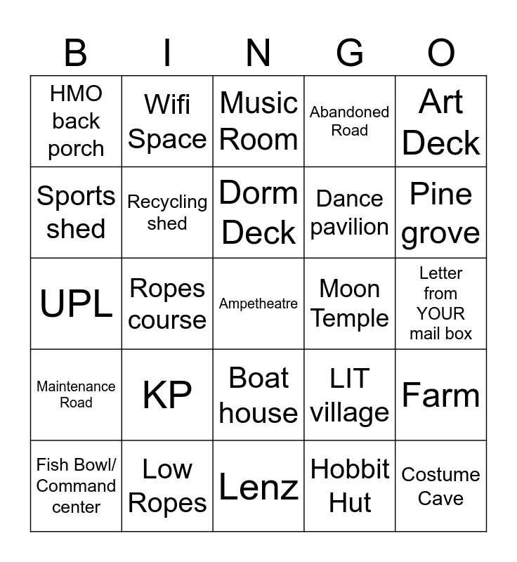 This bingo card has 25 words: KP, Lenz, Dorm Deck, Fish Bowl/ Command center, Art Deck, HMO back porch, Sports shed, Wifi Space, Moon Temple, Boat house, Dance pavilion, UPL, LIT village, Farm, Recycling shed, Costume Cave, Letter from YOUR mail box, Music Room, Pine grove, Ropes course, Ampetheatre, Low Ropes, Maintenance Road, Abandoned Road and Hobbit Hut.