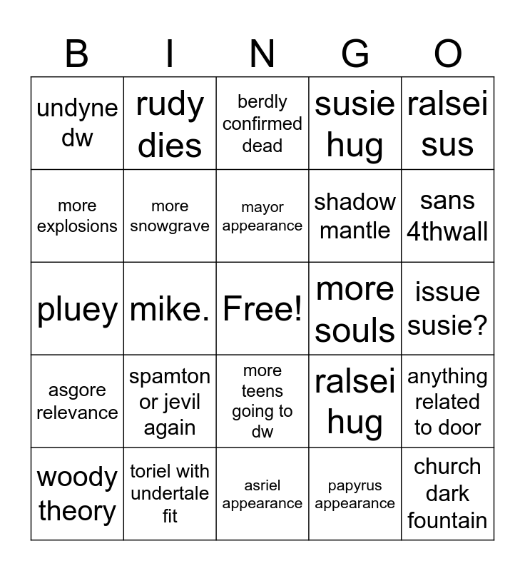 This bingo card has a free space and 29 words: woody theory, dess shows up, mike., info on gaster, undyne dw, berdly confirmed dead, more snowgrave, spamton or jevil again, more souls, toriel with undertale fit, issue susie?, church dark fountain, asriel appearance, papyrus appearance, sans 4thwall, noelle susie date?, more teens going to dw, asgore relevance, ralsei sus, pluey, ralsei hug, lancer statue... again, shadow mantle, more explosions, susie hug, rudy dies, anything related to door, mayor appearance and moss reference.