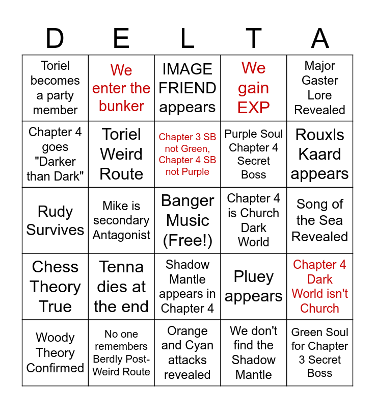 This bingo card has a free space and 29 words: Woody Theory Confirmed, Tenna is a TV head, Mike is secondary Antagonist, No Weird Route in Chapter 3, Toriel becomes a party member, IMAGE FRIEND appears, Toriel Weird Route, Tenna dies at the end, Chapter 4 is Church Dark World, No one remembers Berdly Post-Weird Route, Song of the Sea Revealed, Green Soul for Chapter 3 Secret Boss, Orange and Cyan attacks revealed, We don't find the Shadow Mantle, Rouxls Kaard appears, Undyne in Chapter 3, Shadow Mantle appears in Chapter 4, Chess Theory True, Major Gaster Lore Revealed, Rudy Survives, Pluey appears, We can do Chapter 3 Darkworld without Susie, Purple Soul Chapter 4 Secret Boss, Chapter 4 goes "Darker than Dark", We gain EXP, We enter the bunker, Chapter 4 Dark World isn't Church, Chapter 3 SB not Green, Chapter 4 SB not Purple and Vessel Appears.