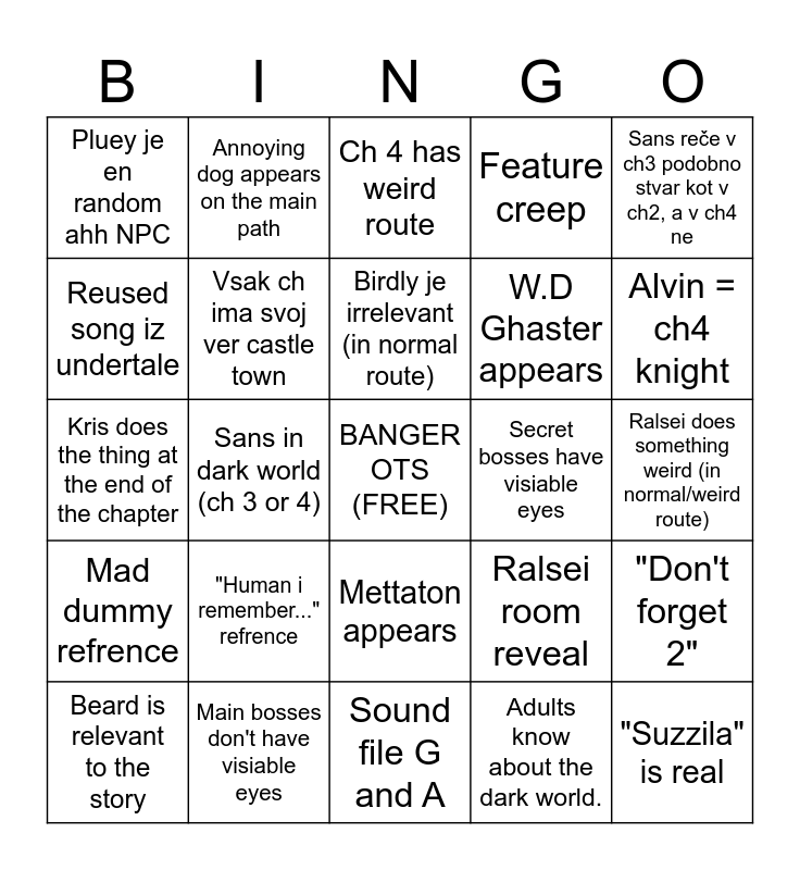 This bingo card has a free space and 24 words: "Human i remember..." refrence, Main bosses don't have visiable eyes, Birdly je irrelevant (in normal route), Beard is relevant to the story, Sans reče v ch3 podobno stvar kot v ch2, a v ch4 ne, Pluey je en random ahh NPC, Reused song iz undertale, Annoying dog appears on the main path, Secret bosses have visiable eyes, Mettaton appears, W.D Ghaster appears, Kris does the thing at the end of the chapter, Ralsei room reveal, "Don't forget 2", Vsak ch ima svoj ver castle town, Adults know about the dark world., Ralsei does something weird (in normal/weird route), Ch 4 has weird route, Alvin = ch4 knight, Sans in dark world (ch 3 or 4), "Suzzila" is real, Mad dummy refrence, Feature creep and Sound file G and A.